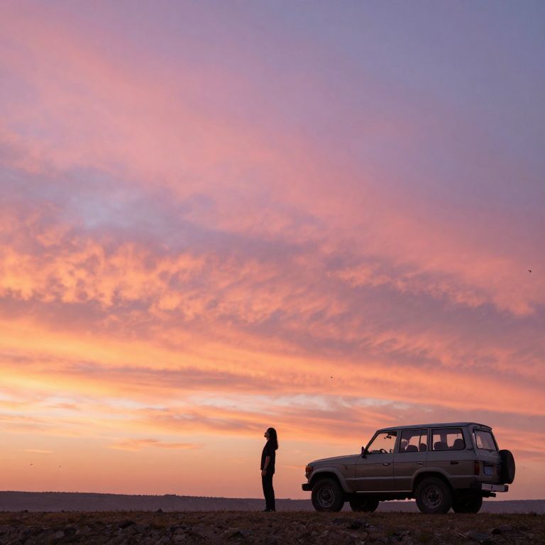 The image features a serene, scenic landscape at sunset with vibrant pink, orange, and purple clouds filling the sky, A lone figure stands near a vintage Toyota SUV, gazing upwards, perhaps lost in thought, while birds fly in the distance, The scene has a peaceful, contemplative atmosphere, with the warm, glowing colors of the sunset creating a dreamlike quality