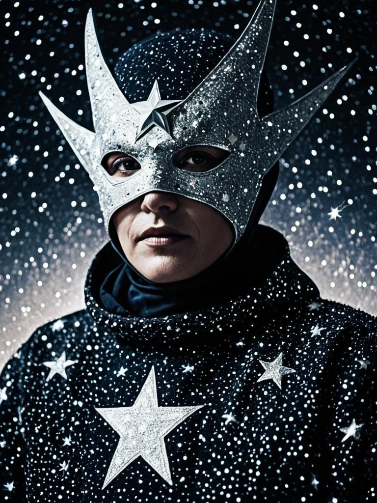 Close-up portrait of a person wearing a dark hooded costume covered in white stars and dots, featuring a large star on the chest and crescent moon shapes on the hood, giving a celestial theme. The person has clear skin with subtle makeup and a calm facial expression against a starry background.