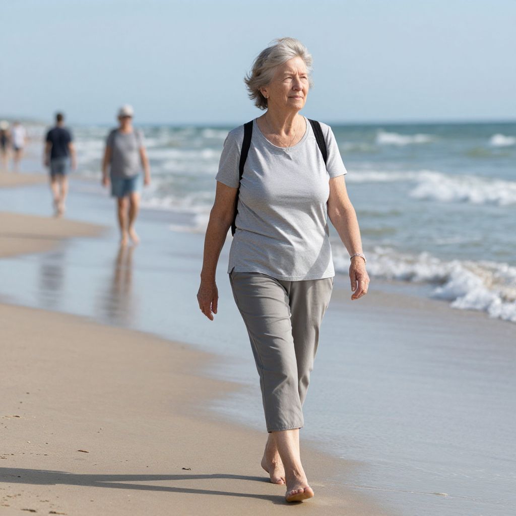 Photograph of an elderly woman with short gray hair walking barefoot along a sandy beach. She wears a white short-sleeved shirt, gray pants, and a black backpack. The ocean with gentle waves is on her right, and the clear blue sky is above. In the blurred background, two people are walking further down the beach. The woman has a relaxed expression, and the sunlight casts soft shadows on the wet sand.