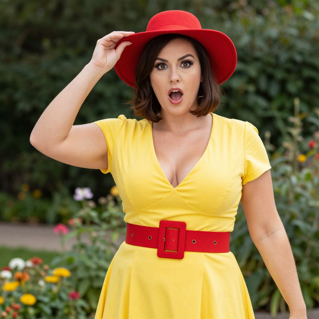 Photograph of a curvy woman with medium skin tone, short brown hair, and striking makeup. She's wearing a bright yellow dress with a deep V-neck, a wide red belt with a square buckle, and a red hat. She's holding her hat with one hand and has a surprised expression with her mouth open. Background features lush greenery and colorful flowers in a garden setting.