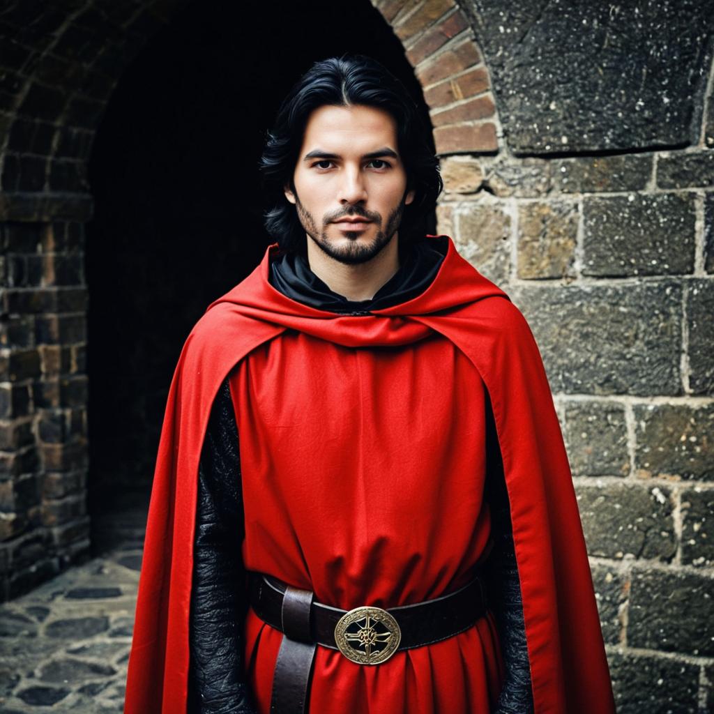 Portrait of a man dressed in medieval fancy attire, featuring a vibrant red cape fastened with a detailed ornamental belt. The man has black hair, well-groomed facial hair, and a serious expression, standing against a stone wall with an arched doorway, evoking a historical atmosphere.