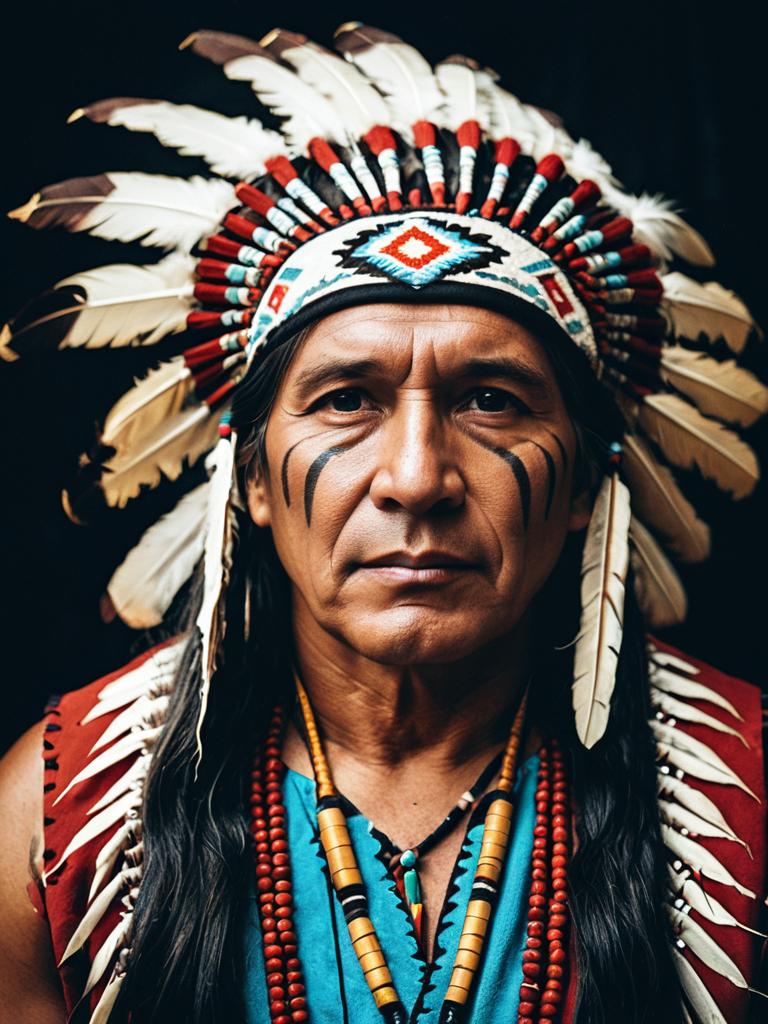 Man in American Indian Native costume, professional cosplay portrait, realistic tones