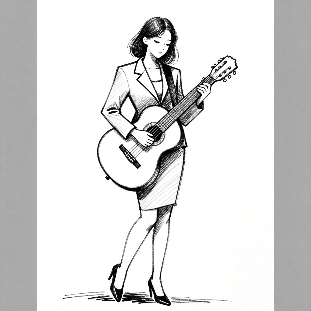 This is a minimalist contour drawing study of a young woman in a fitted blazer and pencil skirt holding a classical guitar. One leg slightly forward, head tilted down, eyes on the strings. Quick gestural lines, confident hatching, smudged shading, casual and spontaneous. High contrast black and white on mostly white background with soft gray side borders and subtle paper texture. Clean composition, minimal props, slight figure tilt. Studio light from above, gentle falloff, elegant and restrained mood.