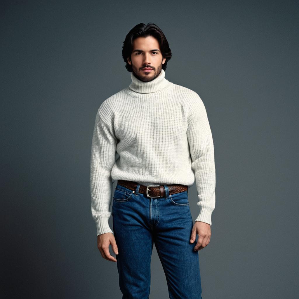 Portrait of a young man with brown hair and facial hair wearing a white knitted turtleneck sweater paired with blue denim jeans and a brown belt. The man is standing against a plain grey background, looking directly at the camera with a neutral expression. The outfit features long sleeves and a casual yet stylish look.