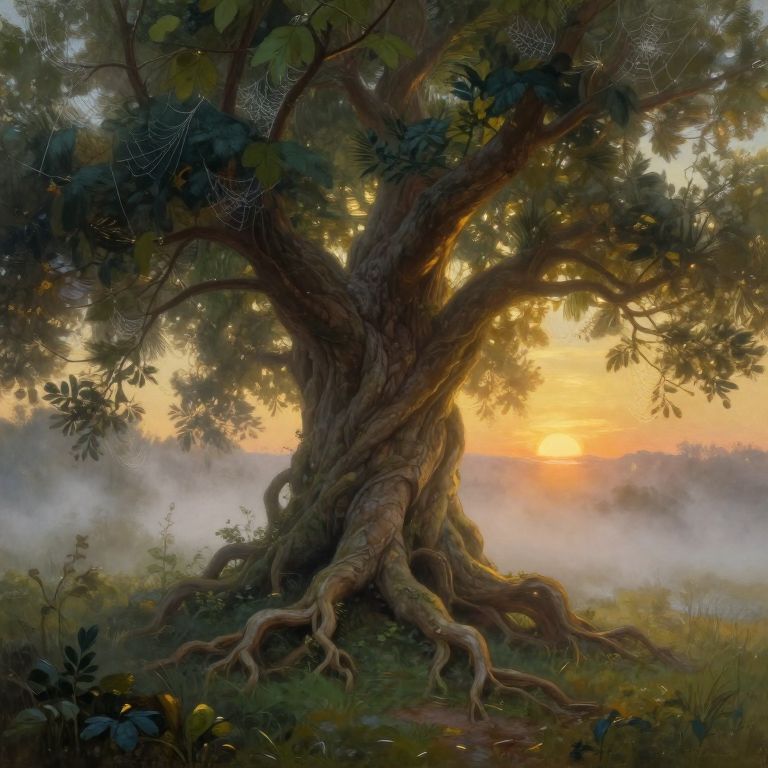 Visualize an intricately detailed digital painting that captures a surreal landscape from a unique vantage point akin to a 'bug's-eye view'. This mesmerizing scene showcases an ancient tree with twisted roots and branches, enveloped by a luminous mist that shimmers with hues reminiscent of an oil-on-canvas artwork. The perspective emphasizes the minute details on the bark, leaves, and delicate spider webs adorning the foliage. As the sun sets behind the horizon, its warm golden rays illuminate the ethereal atmosphere, creating a captivating interplay of light and shadow, instilling feelings of awe, mystery, and serenity in the observer.
