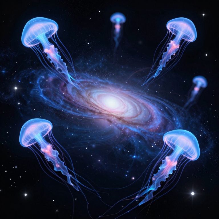 A galaxy pulsates with bioluminescent jellyfish that swim through the stars, propelled by gravity-defying currents of cosmic wind.