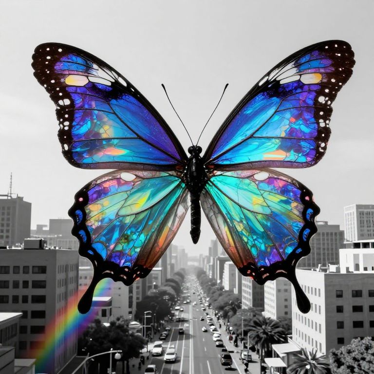 A digital illustration depicts a large, vibrant butterfly with iridescent blue, purple, and green wings, accented by black edges and spots. The butterfly is centered against a black-and-white cityscape, with tall buildings and a street lined with trees and cars. A subtle rainbow appears on the left. The butterfly's wings are open wide, showcasing intricate patterns and a luminous quality that contrasts sharply with the monochrome background. The overall style blends realism with surrealism.