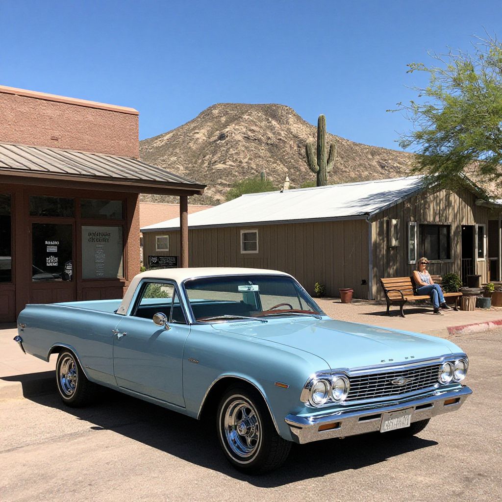 Vintage El Camino parked prominently in downtown Jerome, Arizona, with a woman seated on a bench behind it, observing the scene under a clear blue sky and the backdrop of a majestic mountain.