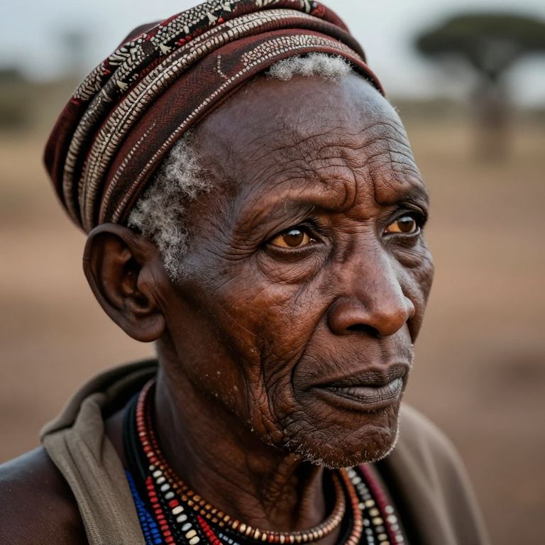 Envision a DSLR portrait capturing an East African elder's piercing gaze, their warm-brown eyes set amidst deep creases etched by time. Rendered in digital artistry, intricate details like skin texture and subtle wrinkles convey resilience and wisdom. Framed by thick, silver-flecked hair tied in a traditional headwrap, the subject gazes thoughtfully into the distance from an elevated perspective, exuding ancestral heritage and emotional depth.