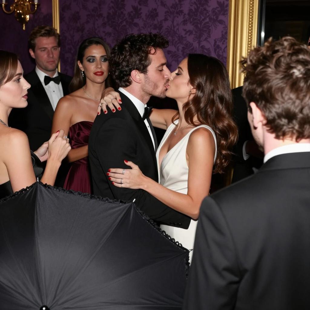Photograph of a scene with three people. A man in a black suit and white shirt passionately kisses a red-haired woman in a black dress with intricate patterns, leaning backward. A man in a red suit with a white shirt and hat leans through an ornate blue and gold archway, pointing at them. Background includes a nighttime cityscape and a red-lit building. Richly decorated room with blue and gold frames, plush yellow chairs. The man in the red suit has a focused expression. The couple's faces show intense passion.
