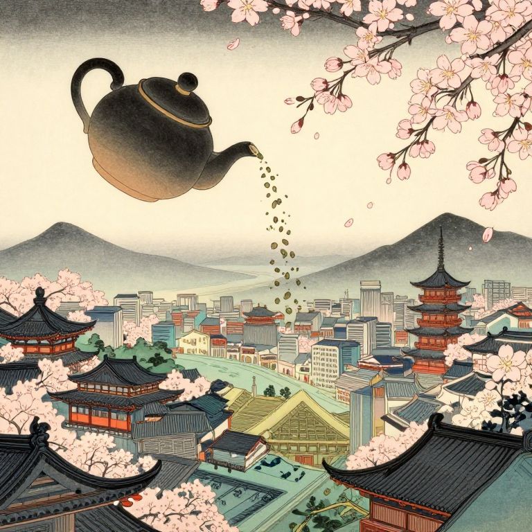 A dreamlike digital artwork blends the bold outlines of Japanese ukiyo-e woodblock prints with a surreal cityscape. In this whimsical scene, a teapot hovers in midair, pouring streams of tea leaves that morph into cherry blossoms as they descend onto an ancient urban landscape below. From a high vantage point, the viewer gazes upon this fantastical world where reality and dreams merge, capturing both the serene allure and subtle unease of this enigmatic vision.