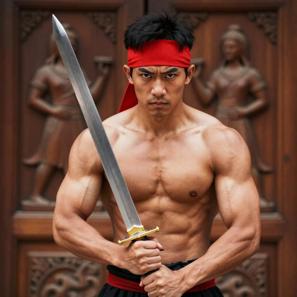 Muscular shirtless man with tan skin, black hair, red headband, holding a sword in a determined stance. Background: ornate wooden carvings. Man's expression: focused, serious. Two figures in relief on wooden panel. Bright daylight.