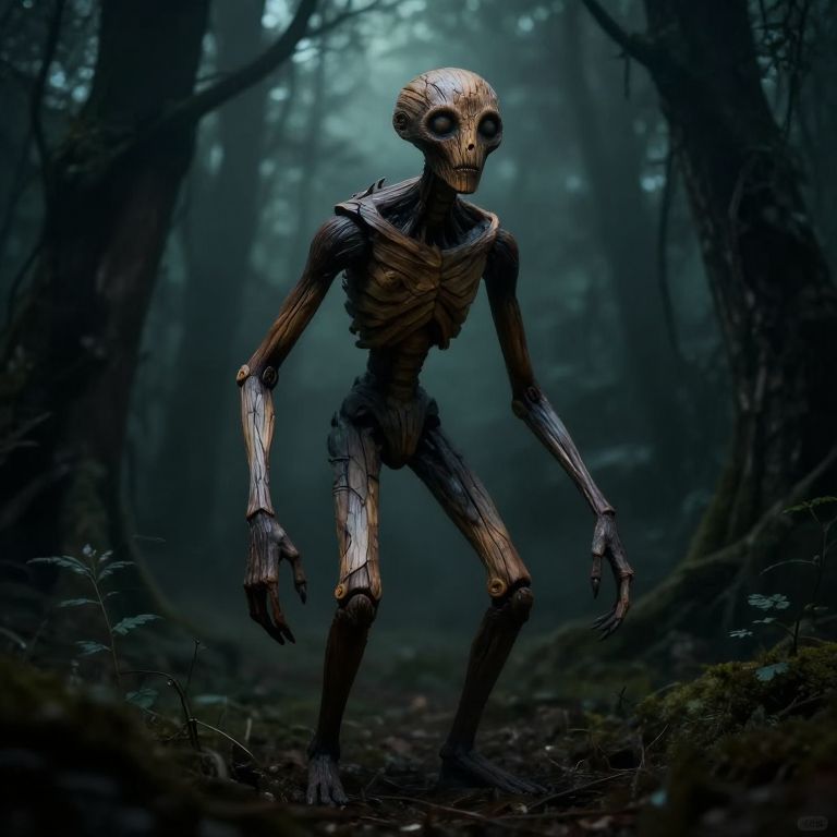 Scp-184 depicted as a surreal, eerie wooden gangly creature with elongated limbs and distorted features, standing in a dark, misty forest environment; atmospheric lighting highlights its creepy, otherworldly presence, blending horror and fantasy art styles.
