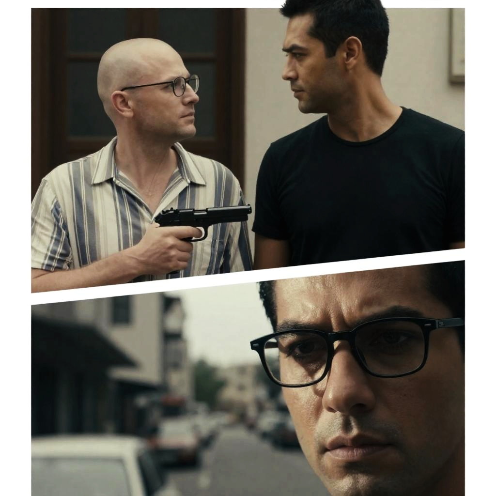 Movie poster collage of "La Casa de la Alegría." Top: colorful photograph with five people in formal attire, one woman with short blonde hair, one man with a mustache. Middle: black-and-white photograph of a man in bed. Bottom: man in green shirt pointing gun, three people in foreground. Bright colors, varied poses, intense expressions.