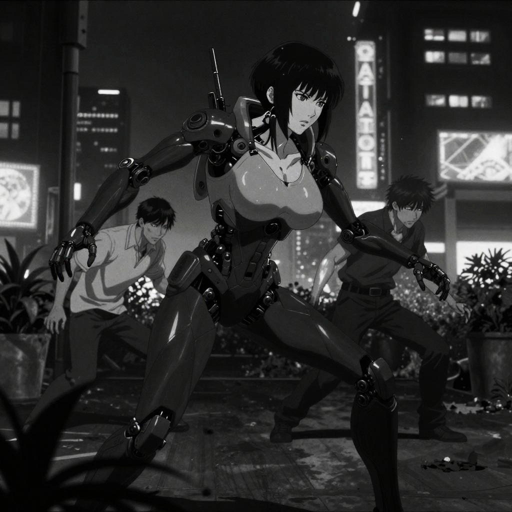 This black-and-white digital anime-style drawing depicts a nighttime urban scene with three characters. At the center, a tall, muscular woman with short black hair, large breasts, and cybernetic armor crouches in a fighting stance. She has a serious expression and her armor is glossy and detailed with mechanical elements. To her left, a shorter man with spiky hair and a casual shirt bends forward, appearing ready to attack. To her right, another man with short hair and a dark shirt also crouches, focused and ready for action. The background features a cityscape with brightly lit neon signs and tall buildings, creating a stark contrast to the dark foreground. Potted plants add a touch of greenery to the scene.
