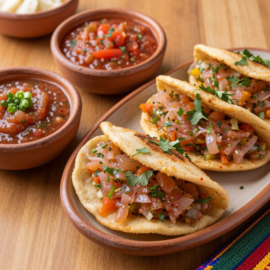 Close-up of pupusas plated elegantly, topped with spicy curtido and assorted fresh salsas, vibrant colors and textures pop against rustic ceramic dishes, garnished with fresh herbs on a wooden table, traditional Salvadoran comfort food, natural lighting
