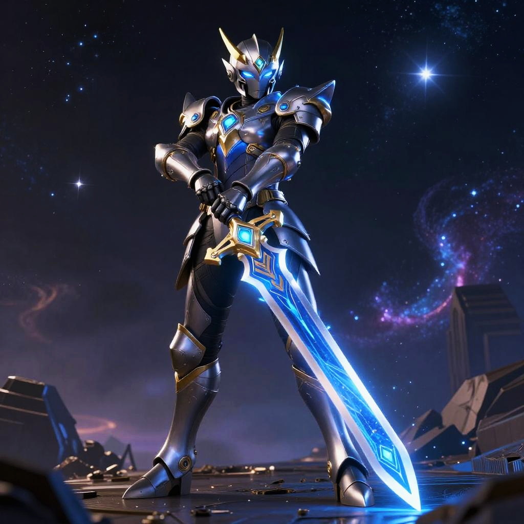 Joyeuse-inspired futuristic sword glowing with neon blue and gold light, held by a heroic figure in sleek armor, standing against a backdrop of a cosmic battlefield with stars and nebulae