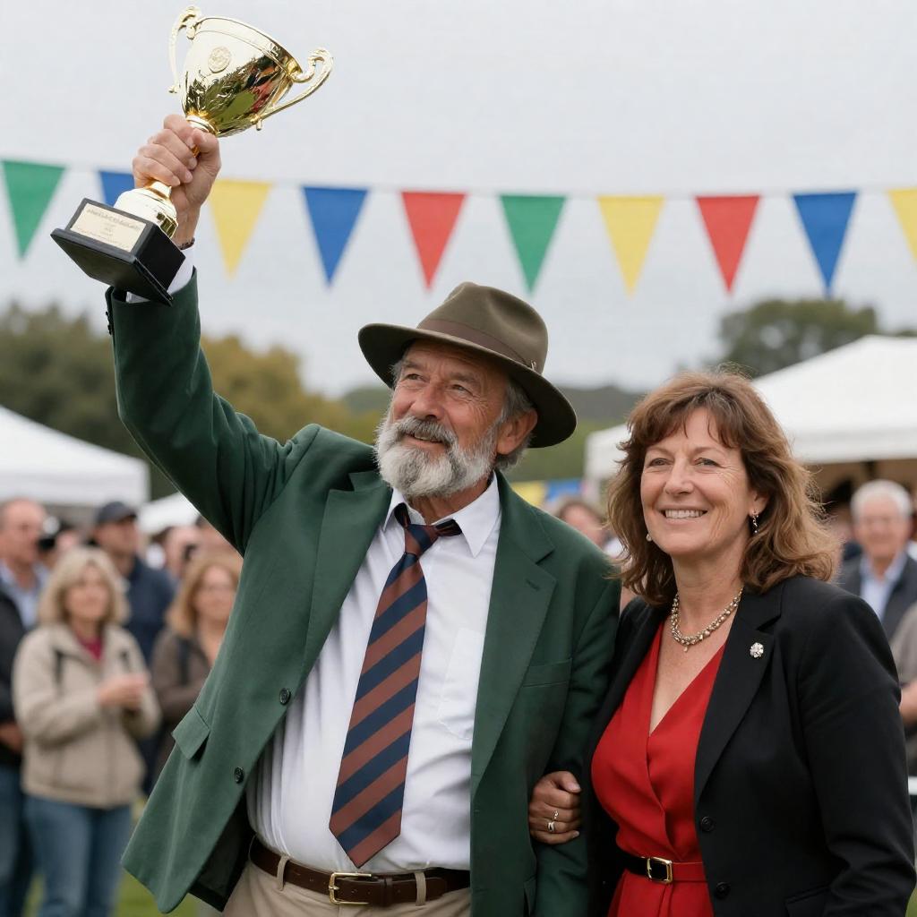 Photograph of a festive outdoor event. Older man with gray beard, green jacket, striped tie, and hat raises arm, holding trophy. Smiling woman with brown hair, black jacket, red dress stands beside him. Crowd in background, colorful flags above.