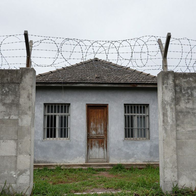 The image depicts a small, dilapidated house surrounded by concrete walls and barbed wires. The house, painted in a muted gray, features a weathered wooden door and two windows with barred grills. The roof is covered with a tangle of barbed wires, creating a sense of enclosure and restriction. The house is situated on a patch of grass, with the concrete walls forming a stark, imposing boundary around it. The overall scene conveys a sense of isolation and confinement, with the barbed wires adding a layer of tension and danger to the environment.