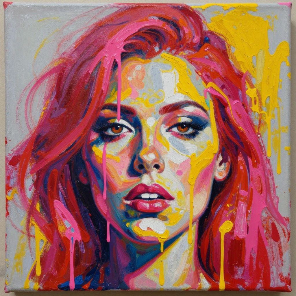 This is a digital painting in a vibrant, abstract style depicting a close-up of a woman with striking red hair. The hair is painted with bold, sweeping strokes in red, pink, and yellow, with yellow paint dripping down. Her face, with green eyes, full lips, and a neutral expression, is highlighted with intense colors including white, blue, and pink, creating a vivid, almost neon effect. The background is a muted gray, which contrasts with the bright colors of her hair and face. The texture is rich and textured, with visible brushstrokes adding depth to the image. The overall style is modern and expressive, blending realism with abstract elements.