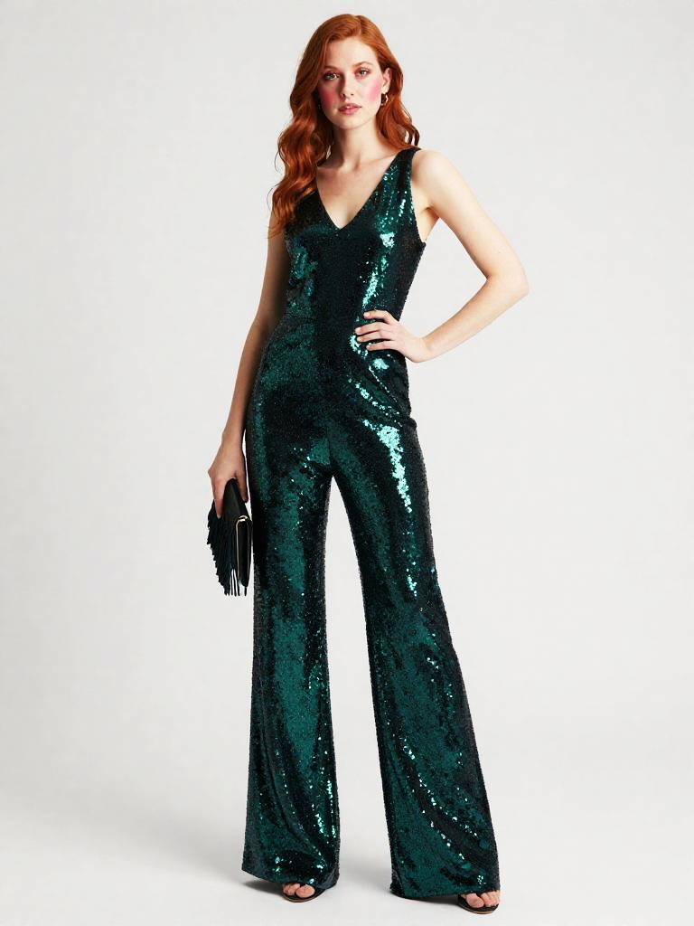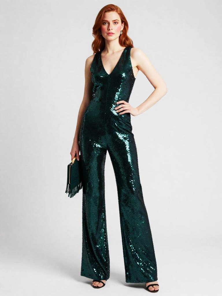 Sequin Jumpsuit, full-body studio fashion photo of pale redhead with loose waves and rosy cheeks wearing a sleeveless V-neck sequin jumpsuit in deep emerald green sequins, wide-leg trousers skimming the floor, model standing with one hand on her hip and the other holding a small fringed clutch at her side, posed at a slight angle to the camera, clean white studio backdrop and bright catalog-style lighting
