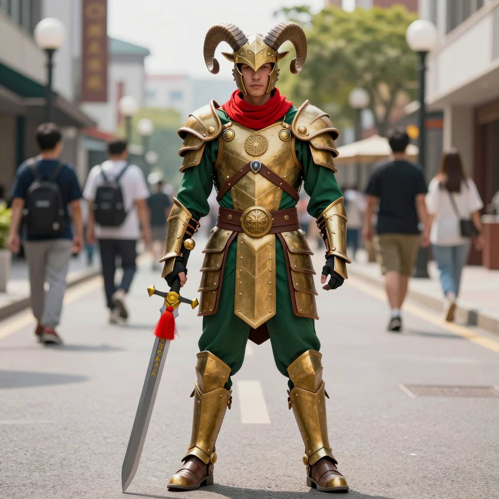 Ophanim costume, photorealistic, full-body shot of a person wearing a fantasy warrior costume, medieval helmet with curved horns, metal face mask, red scarf, brown leather armor, green pants, brown boots, standing in a sunlit stone plaza, daytime, realistic lighting, urban background, focused on character, medium shot, detailed ures, fantasy genre, costume design, realistic color palette, medieval fantasy style, photorealistic CGI, T2I, character centered