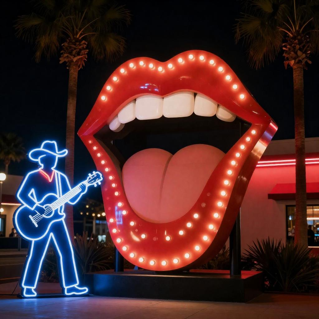 Photograph of a nighttime scene featuring a large, illuminated marquee sign shaped like an open mouth with red and white lights. To the left, a blue neon silhouette of a cowboy holds a guitar. Palm trees are visible in the background, partially illuminated by red neon on the right.