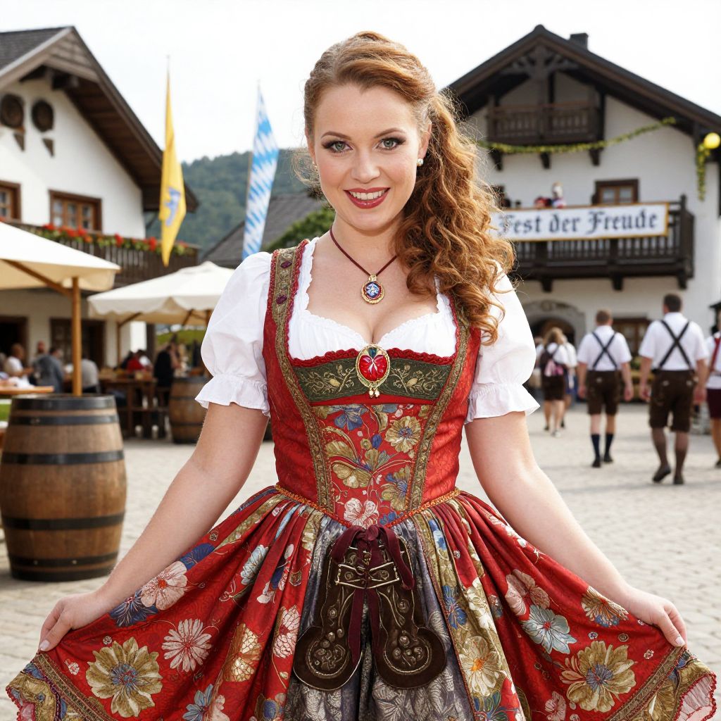 A high-definition portrait of Olga, a cheerful woman with fair skin, a curly auburn ponytail, and bright green eyes, dressed in a stunning handmade Oktoberfest costume with a flowing red and gold gown, large floral patterns, and a decorative brooch. She stands in front of a traditional Bavarian village square with beer barrels, flags, and a large banner reading 'Fest der Freude'. The scene is photographed in soft daylight with natural shadows and a rich festive color palette.. The woman has big tits and cute face