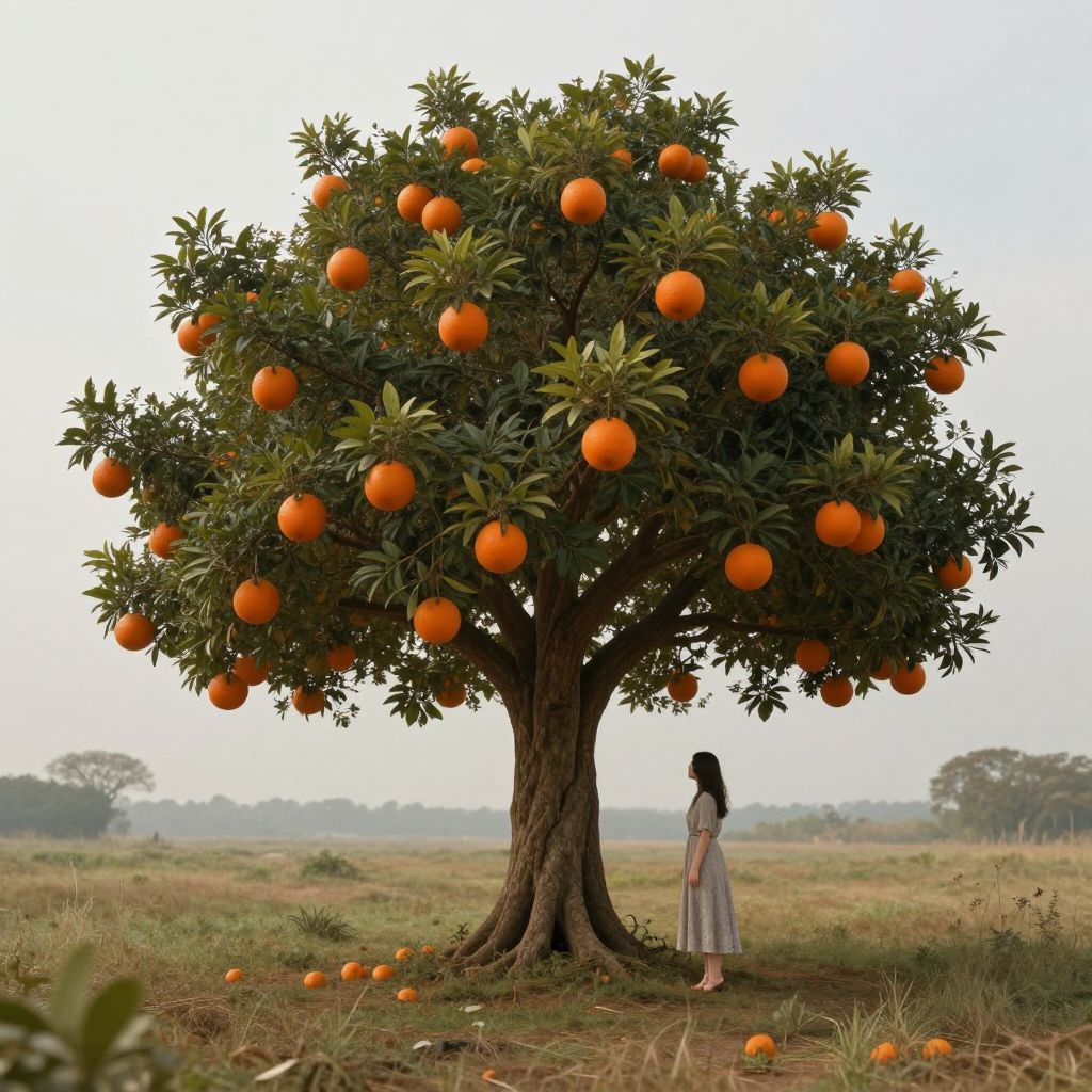 Photograph of a large orange tree laden with bright orange fruits, standing in a grassy field. A woman with long dark hair, wearing a light-colored, long dress, stands with her back to the tree, gazing at it. The sky is overcast, and the horizon shows distant trees. The tree's trunk is thick and textured, with green leaves surrounding the vibrant oranges. Scattered orange fruits lie on the ground near the base of the tree. The overall scene exudes a serene, rural atmosphere.