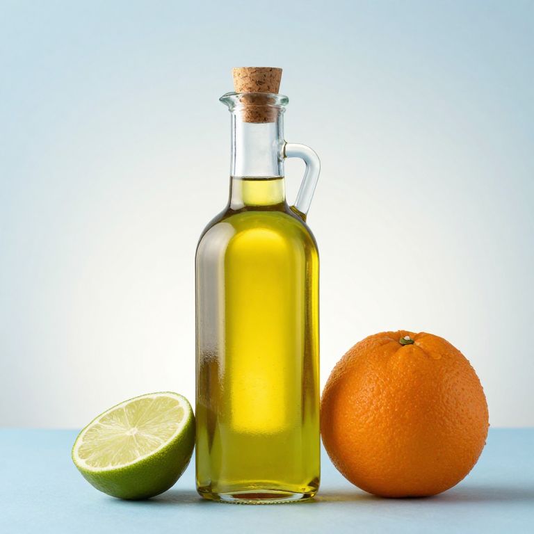Still life composition featuring a transparent glass bottle filled with golden olive oil, corked at the top, accompanied by a whole orange and a halved lime resting on a light blue surface against a soft gradient background.