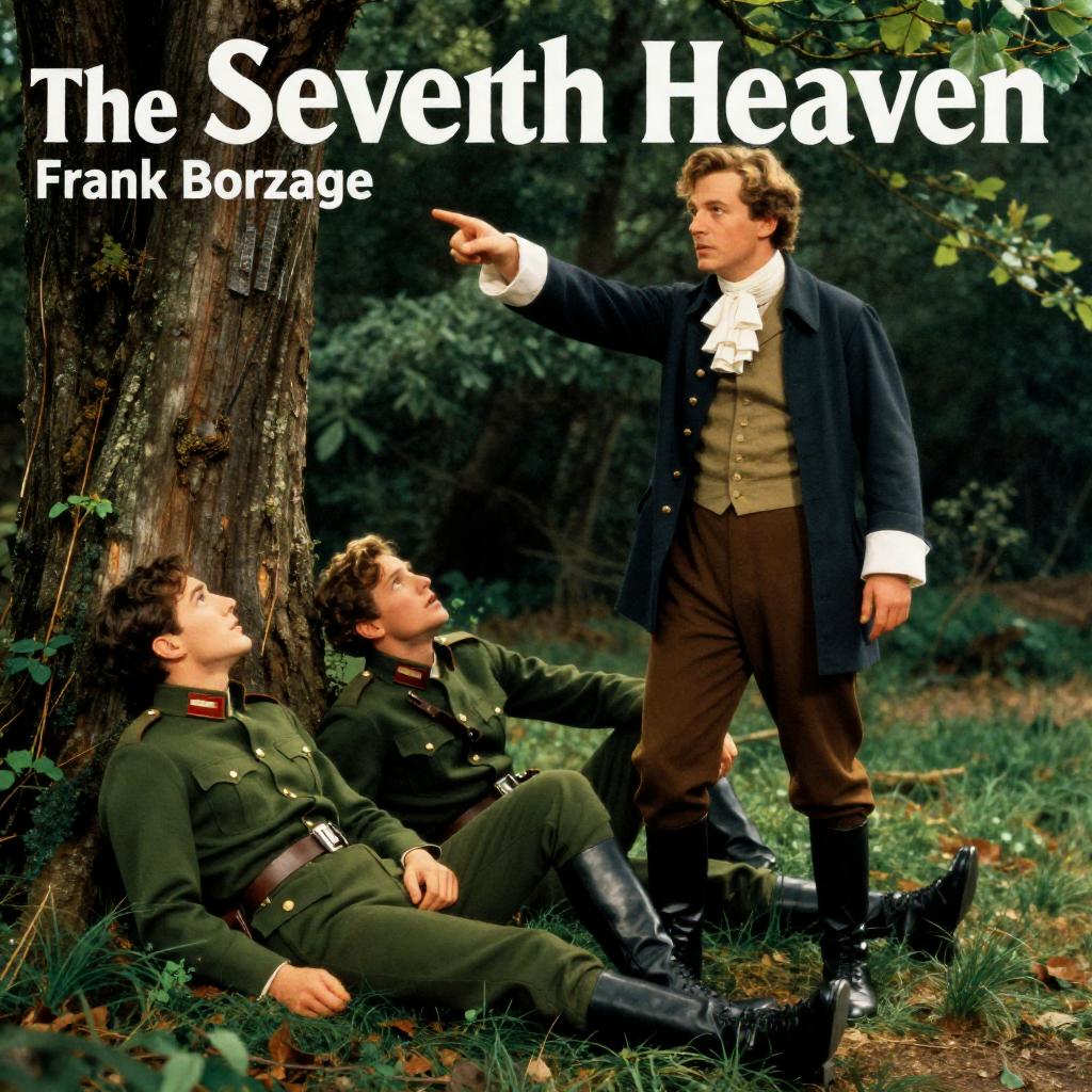 Movie poster of "The Seventh Heaven" directed by Frank Borzage. A man in 18th-century attire stands, pointing right, while two men in green military uniforms sit and lie on grass in a forest. Dense green foliage surrounds them. One man looks up at the standing man with a surprised expression. One man lies on the ground, head back. Poster includes vibrant colors and dramatic lighting.