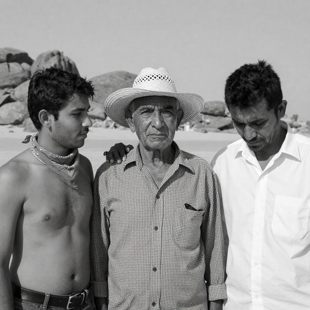 Black-and-white photograph of three men in a desert landscape. Central older man with checkered shirt, straw hat, and serious expression stands between two younger men. Left man shirtless, bandana around neck, looking at central man. Right man in white shirt, head down, looking away. All men have short, dark hair. Central man's arm around left man's shoulder. Desert rocks in background.