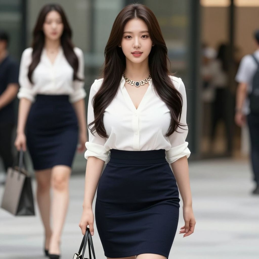 Photograph of an Asian woman with long, wavy black hair and fair skin, walking confidently in an urban setting. She wears a white, button-down blouse with the top buttons undone, emphasizing her cleavage, and a form-fitting black pencil skirt that accentuates her curvy figure. She accessorizes with a statement necklace and carries a black handbag in her right hand. In the blurred background, another woman with similar attire is visible, walking in the opposite direction. The setting appears to be a busy city street with glass buildings and pedestrians. The overall color palette includes black, white, and hints of gray.