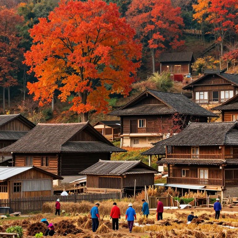Photograph of a rural village with traditional wooden houses, vibrant red-orange autumn tree, and people in colorful jackets harvesting hay.