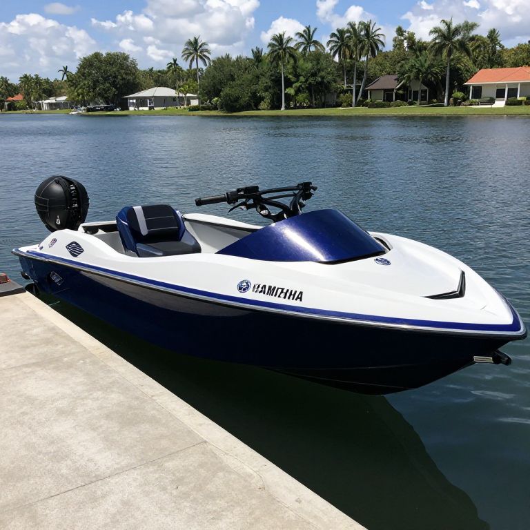 Photograph of a white and blue Yamaha jet ski docked by a calm lake, with palm trees and houses in the background.
