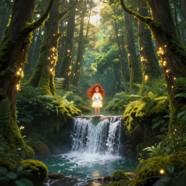 Digital illustration of a young girl with long black hair, wearing a green dress, standing in a glowing green energy vortex in a rocky cave.