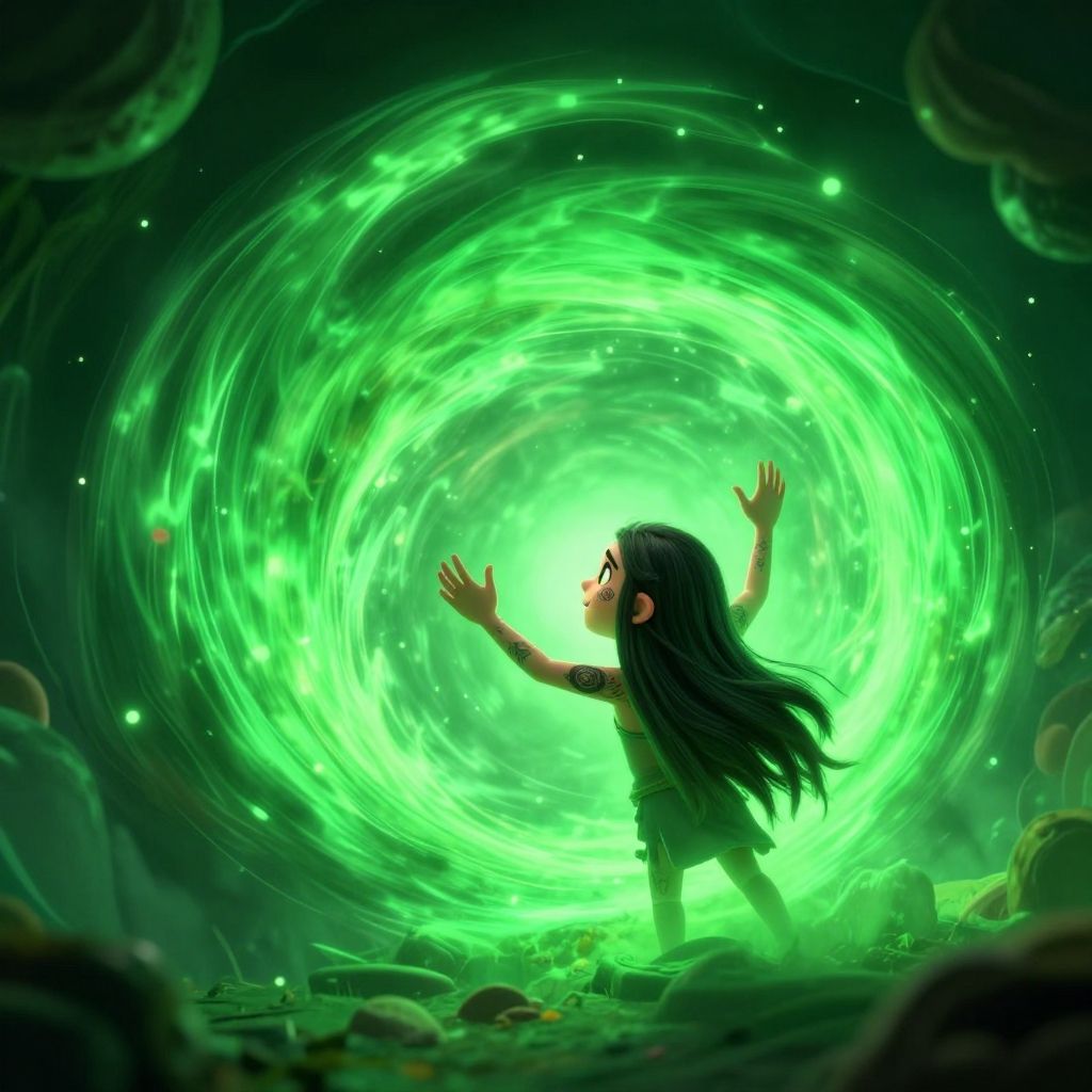 Digital artwork depicting a young girl with long black hair and dark clothing standing in a rocky, dimly lit cave. She faces a swirling, bright green, magical vortex with her arms raised. The vortex emits glowing green energy, illuminating her profile and surrounding rocks. The background is dark, with faint, floating green orbs and subtle, circular light patterns. The girl's expression is one of awe and determination. The image has a fantastical, anime-inspired style with vibrant colors and dynamic lighting, emphasizing the magical energy and the girl's connection to it.
