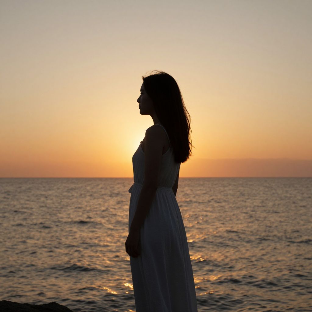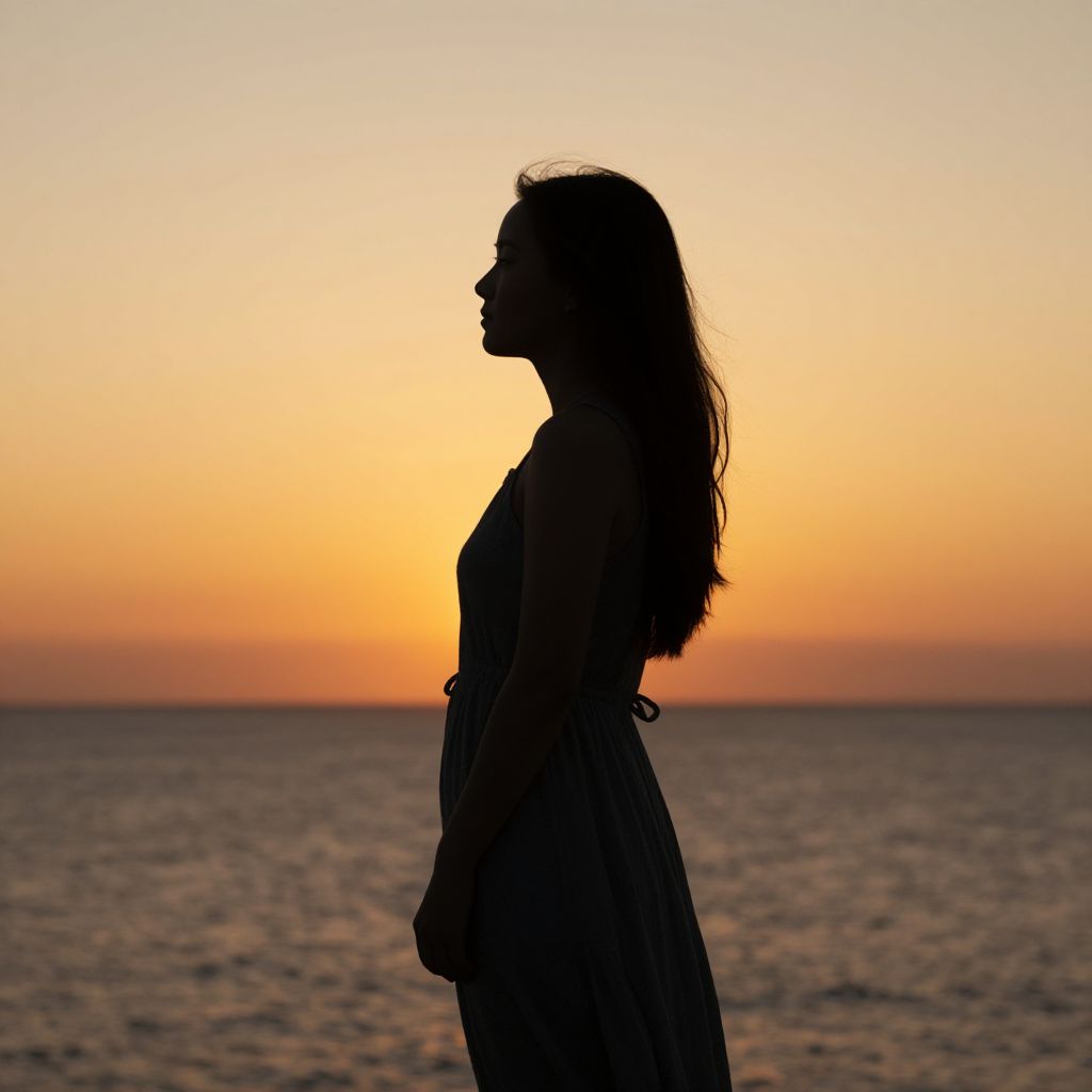 Bathed in the golden embrace of twilight, a woman stands by the sea, her silhouette etched against the horizon, embodying a quiet introspection that whispers of freedom, solitude, and the eternal pull of the unknown.