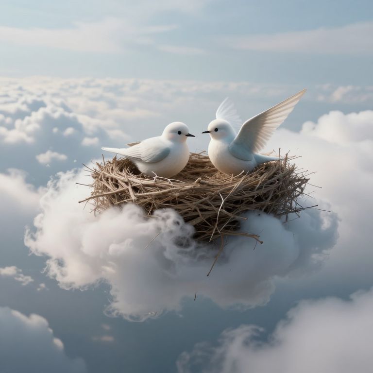 Two ethereal birds perch serenely in a nest suspended amidst swirling clouds, defying gravity as they rest upon a realm where earth meets the heavens.