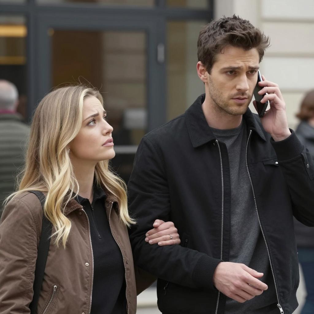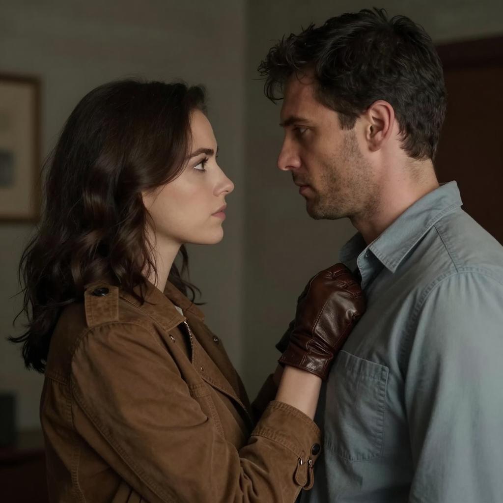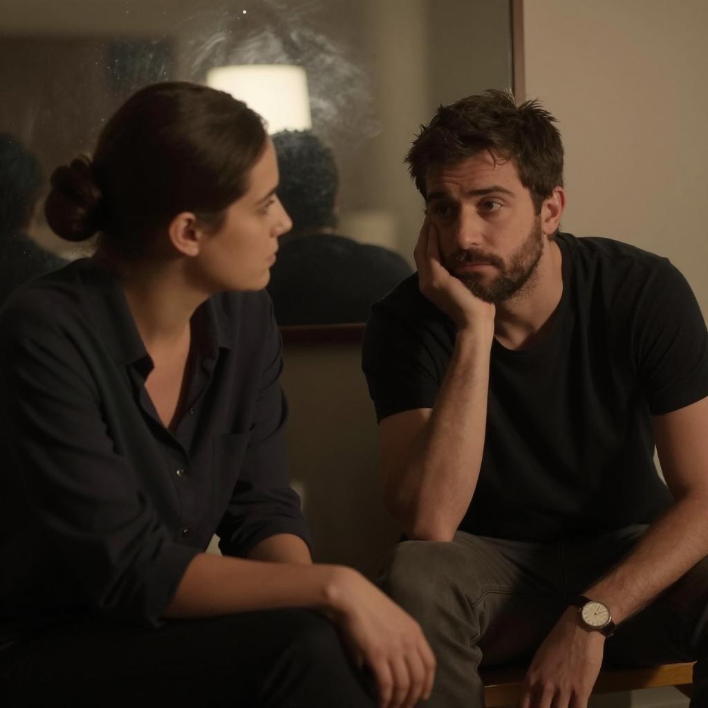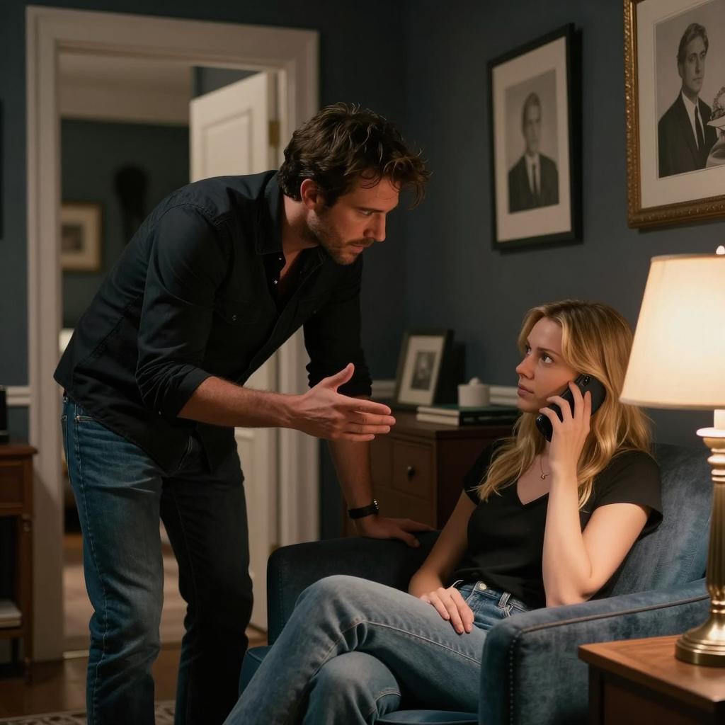 Photograph of a man and a woman in a dimly lit room. Man with dark hair, black shirt, and blue jeans, leans forward, gesturing with right hand. Woman with blonde hair, topless, sitting in a blue armchair, holding phone to ear. Lamp with patterned shade on right, framed pictures on dark walls. Background includes an open doorway and a shadowy figure.