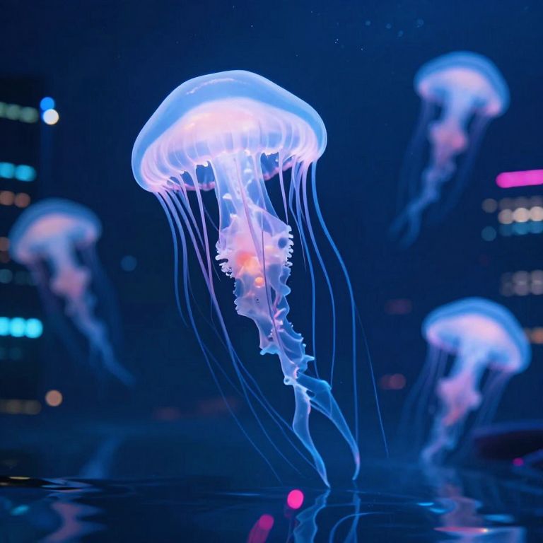 Giant jellyfish drift serenely through a neon-lit cityscape, their ethereal glow casting surreal reflections on the water below, evoking a dreamlike transcendence where the boundaries of reality dissolve into infinite possibility.