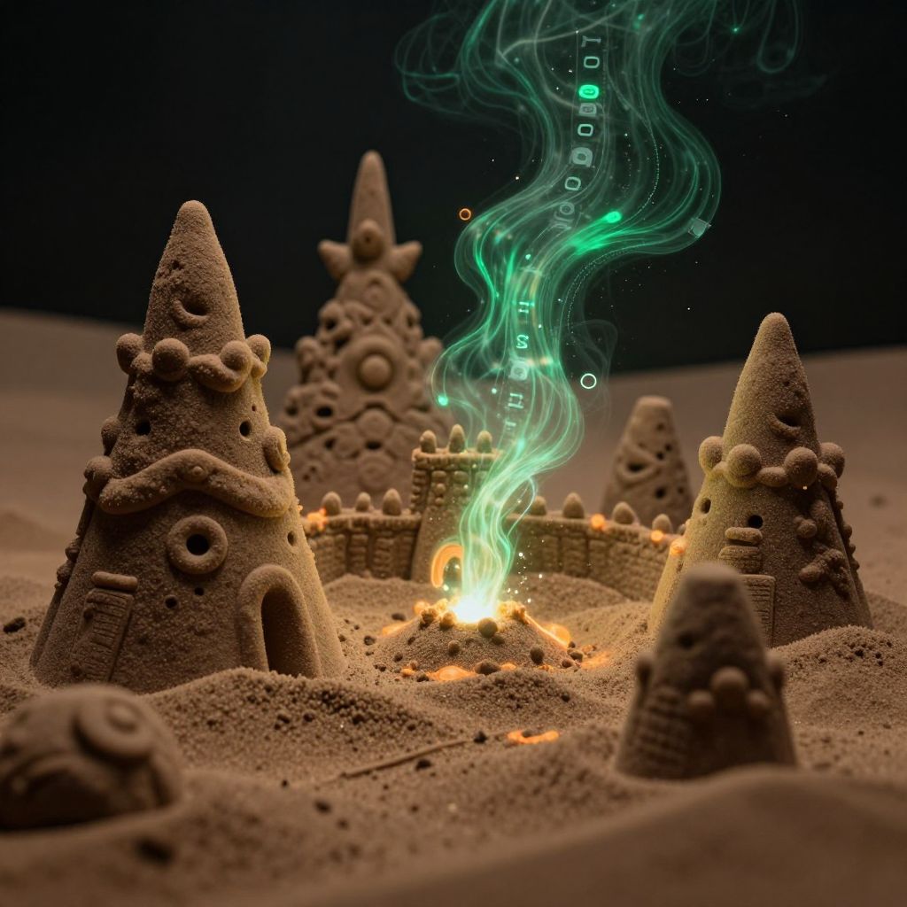 Photograph of a sandcastle sculpture under a dark night sky. The sandcastle features four conical towers with circular and dot patterns, surrounded by a circular wall. A glowing green, ethereal, wavy light, resembling a digital code or signal, descends from the top center, illuminating a central fire-like glow that burns within the castle. The sand's texture is granular, and the overall scene has a mystical, otherworldly feel. The background is a deep black, contrasting sharply with the illuminated sandcastle and light.