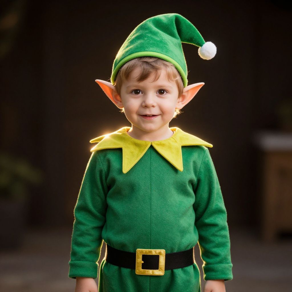 Photograph of a young child with light brown hair and fair skin, standing against a dark, blurred background. The child wears a green elf costume with pointed orange ears, a yellow collar, and a black belt with a gold buckle. The elf hat is green with a white pom-pom at the tip. The child has a slight smile and is centered in the frame, looking directly at the camera. The costume is made of a soft, textured fabric, and the lighting highlights the child's face and costume details.