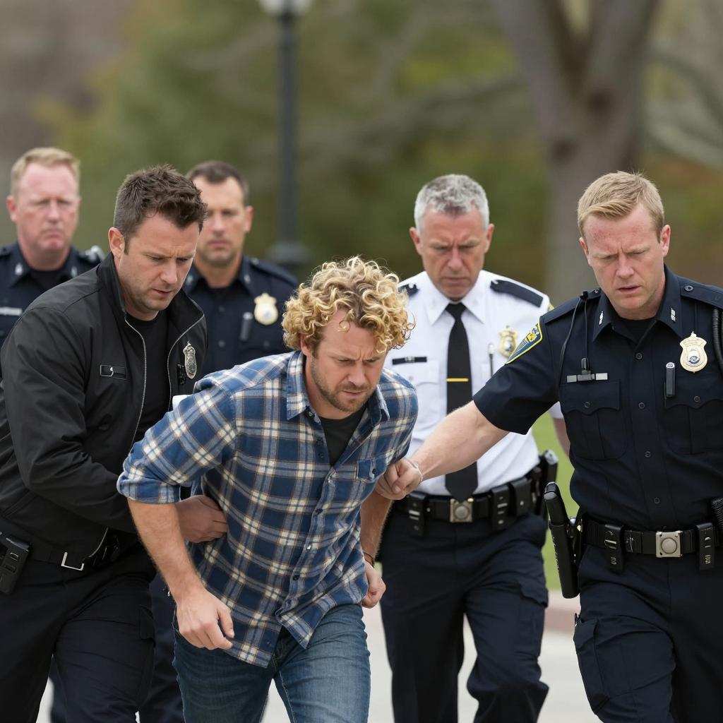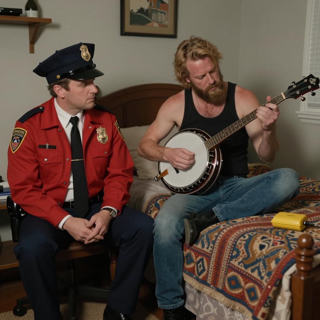 Photograph of two people in a dimly lit room. A man in a red jacket, black tie, and police cap sits on the left. A blonde man with a beard, black tank top, and blue jeans sits on a bed playing a banjo on the right. The bed has a colorful patterned blanket. Yellow item on a small table near the blonde man. The blonde man looks down at the banjo, while the man in the red jacket looks at him.