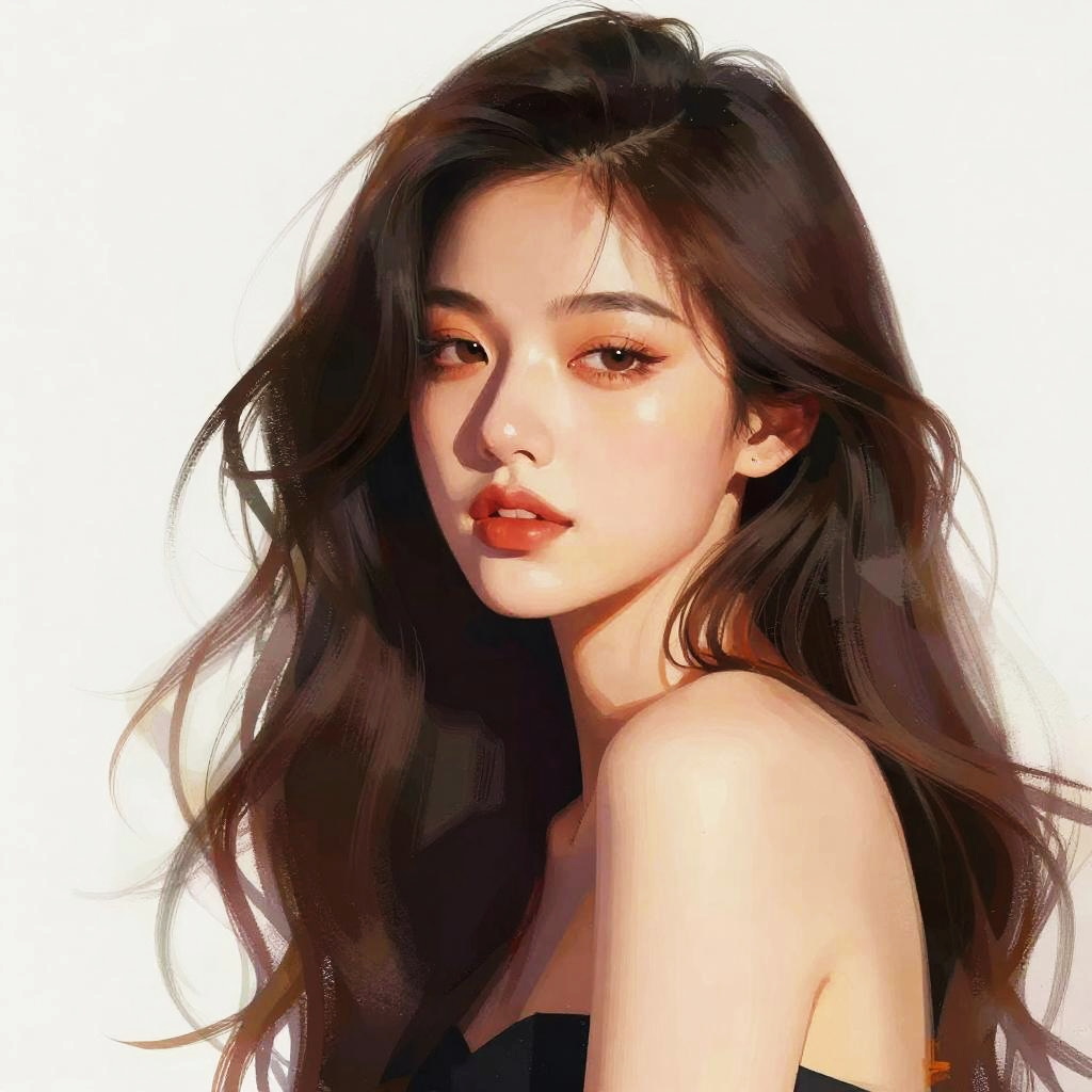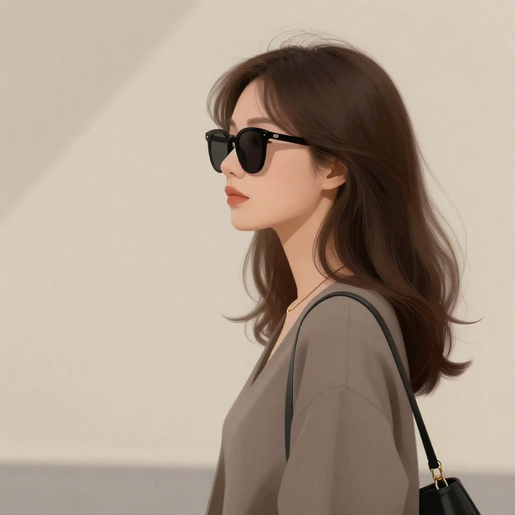 Digital illustration of a woman in profile, facing left. She has wavy brown hair, wears sunglasses, a gray top, and a necklace. Background is a blurred beige wall. Her expression is neutral. Upper body is visible. Light shadows.