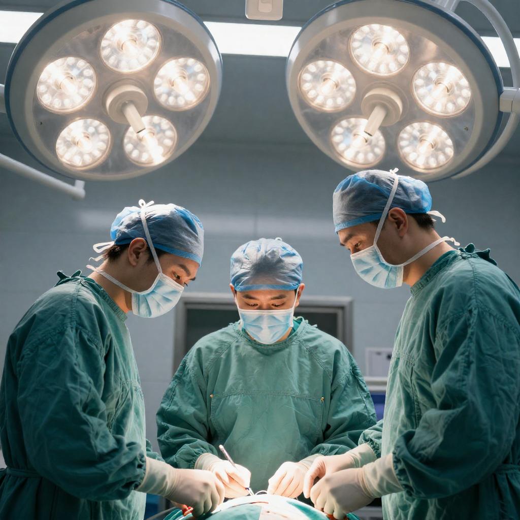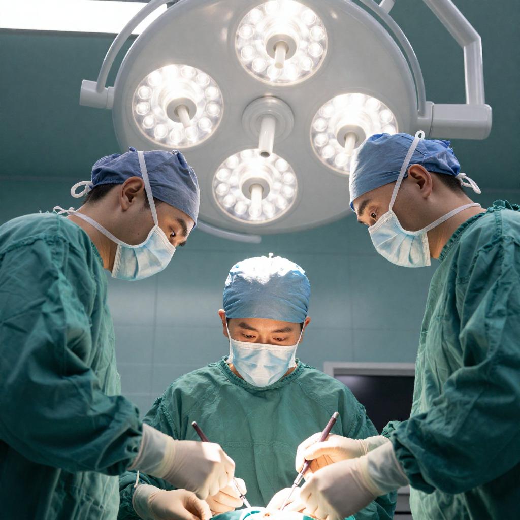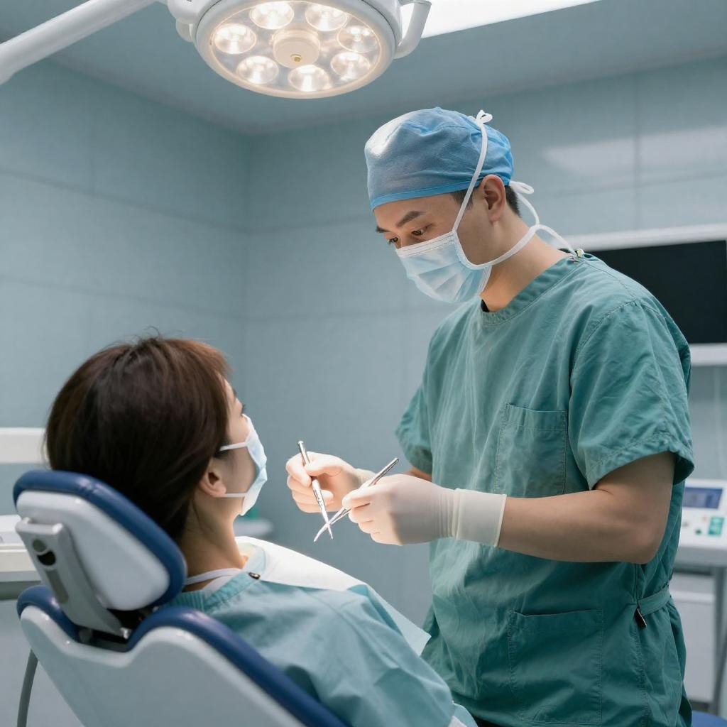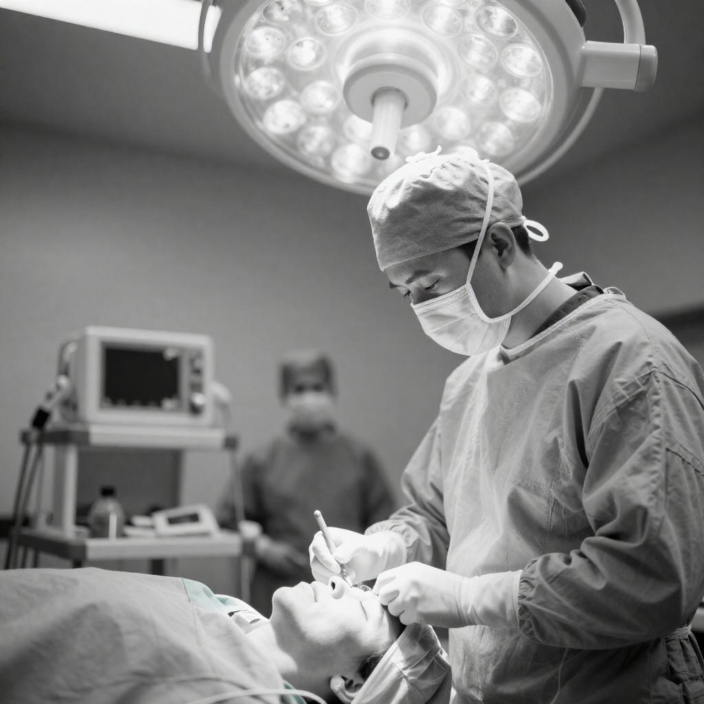 Photograph of a medical scene in a blue-lit room. A patient with blonde hair, wearing a white gown, is seated in a dental chair with restraints on their legs. Two medical professionals in blue scrubs and masks stand on either side, one holding a tray and the other near a counter. Overhead surgical lights illuminate the scene.