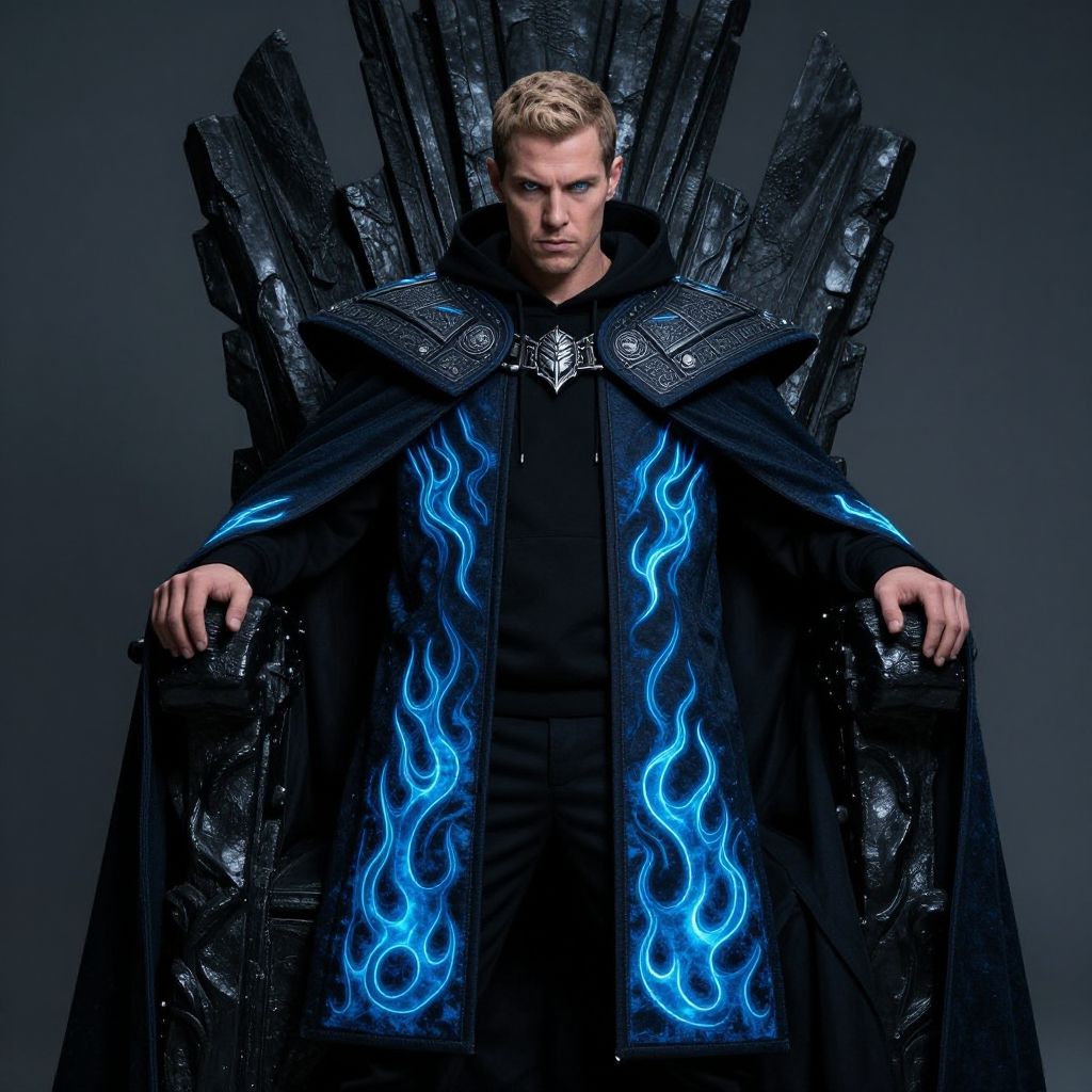 Photograph of a blonde, muscular man with a stern expression, sitting on a large, black, throne-like chair with multiple armrests. He wears a detailed black cloak adorned with glowing blue flame patterns and intricate silver embroidery on the shoulder pieces. The background is a solid, dark grey. His hands rest on the armrests, and the lighting emphasizes the vivid blue flames and the texture of the cloak and chair. The overall style is dark, fantasy-inspired, reminiscent of Gothic or medieval themes.