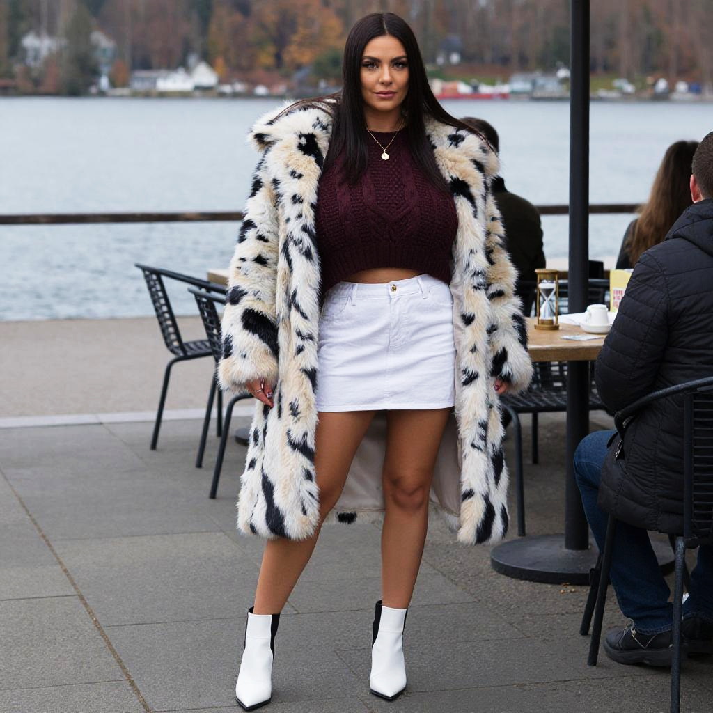 Photograph of a confident woman with long black hair, wearing a black-and-white fur coat, brown top, white mini-skirt, and white boots
