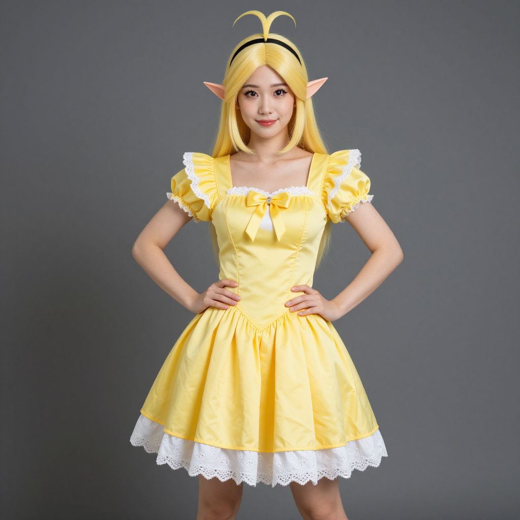 Photograph of an East Asian woman cosplaying as a fantasy elf. She has long, straight blonde hair, pointed ears, and wears a yellow, puffed-sleeve, knee-length dress with a white lace trim. A black headband with a small yellow antennae-like decoration sits on her head. She stands against a solid gray background with her hands on her hips, smiling slightly. The dress has a central bow at the neckline and a fitted waist, accentuating her slim figure. The overall style is whimsical and cute, typical of fantasy cosplay.