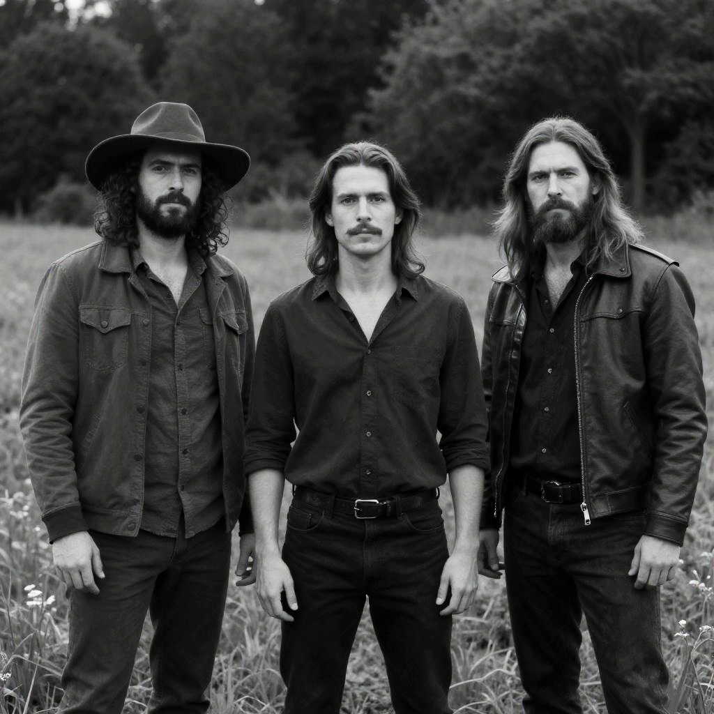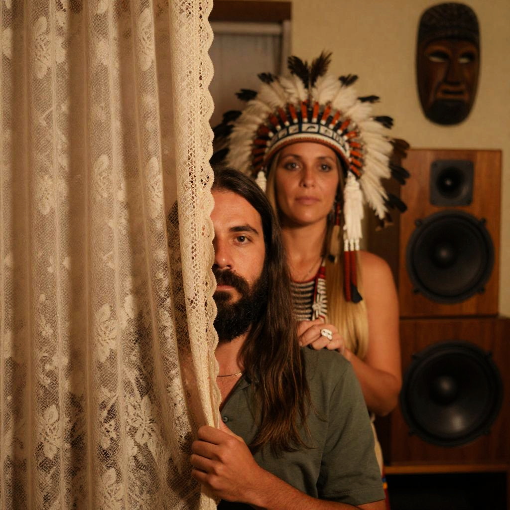 Photograph of two people, a bearded man with long hair in a green shirt, and a blonde woman with a Native American headdress. She stands behind him, both partially hidden by a lace curtain. Large wooden speaker with two speakers in the background, and a carved wooden mask on the wall. Warm, dim lighting.